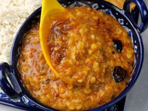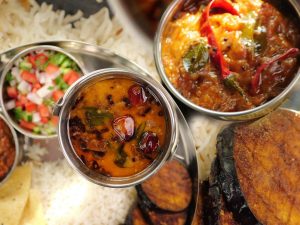 Daal Chawal Platter with Crispy baingan, Chana daal & Keri Tamatar Chutney