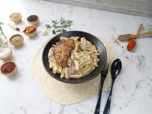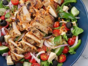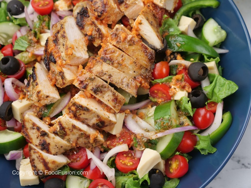 -On a frying pan,add cooking oil,marinated Greek chicken (thawed overnight) & cook on low flame from both sides until done (3-4 minutes each side).