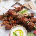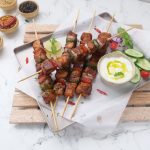 -Skew fiery chatkhara marinated chicken (thawed overnight) on wooden skewers along with onion,capsicum & tomato.