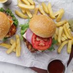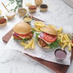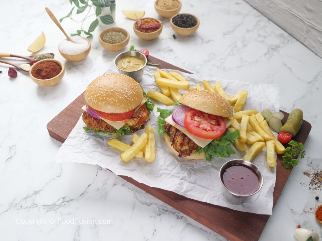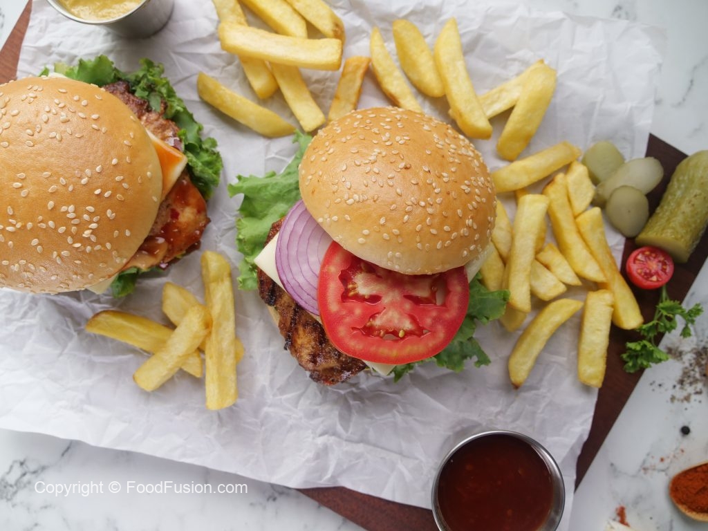 -On burger bun,add burger sauce,lettuce leaves,tomato ketchup,cooked chicken,cheese slice,onion,tomato slice,tomato ketchup & cover with top bun to make burger.