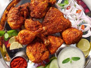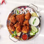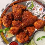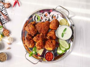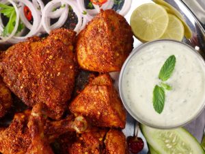 -In a bowl,add yogurt,ginger garlic paste,orange food color,cornflour,prepared spice mix (reserve 1 & ½ tbs for later use),soy sauce,chilli sauce,lemon juice & mix well.