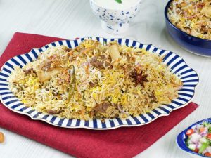 Bowl mein fried pyaz,tamatar,hari mirchein,aalo bhukara,podina,hara dhania,biryani masala aur lemon juice dal ker ache tarhan mix ker lein & side per rakh dein.