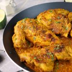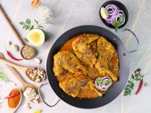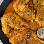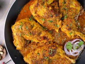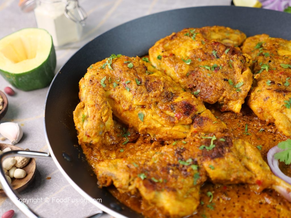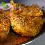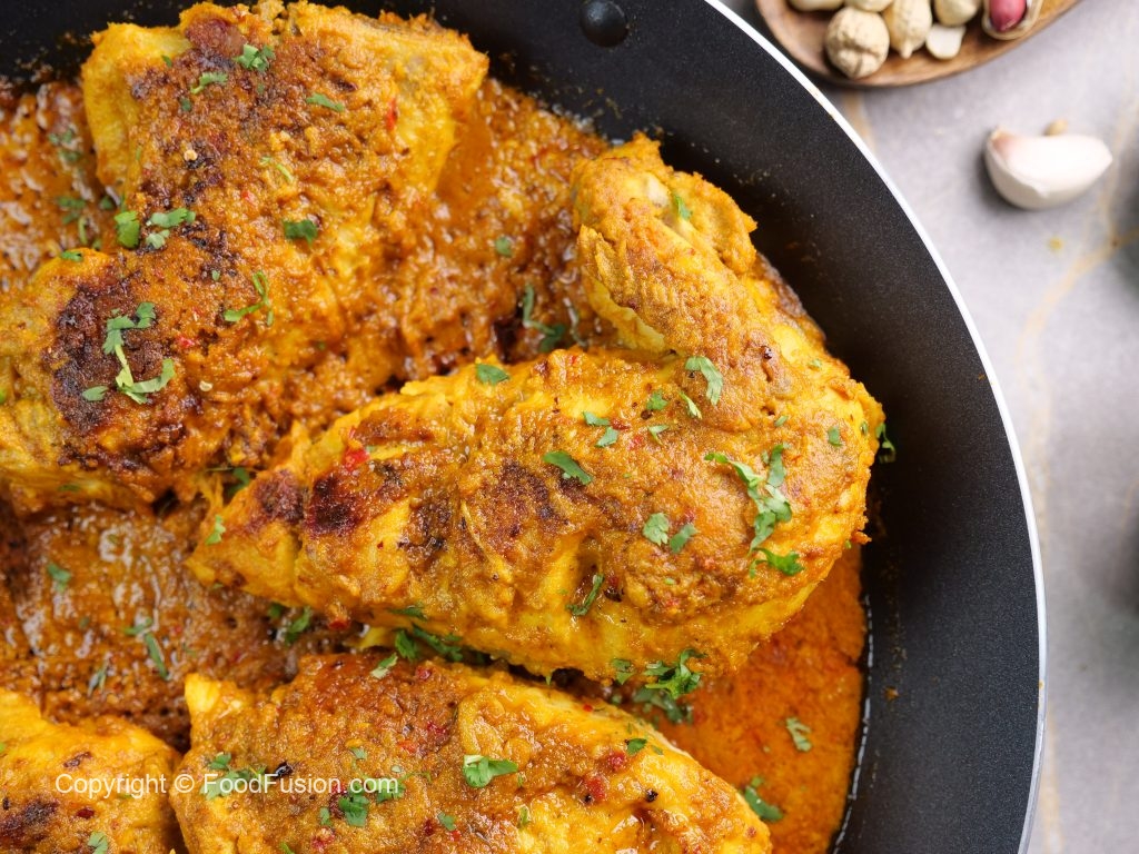 -In a large wok,add cooking oil,marinated chicken,apply remaining marinade & cook on low flame for 15-20 minutes & turn sides in between.