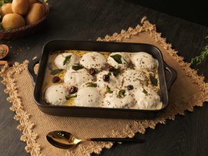 -In a serving dish,add aalo baray,drizzle prepared yogurt mixture,pour tarka & serve!