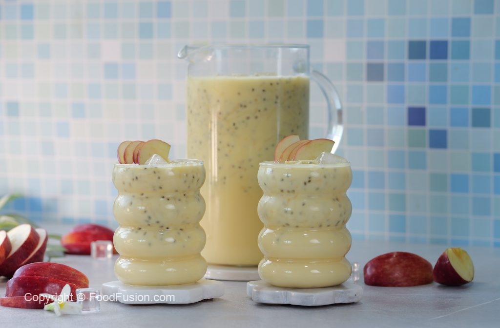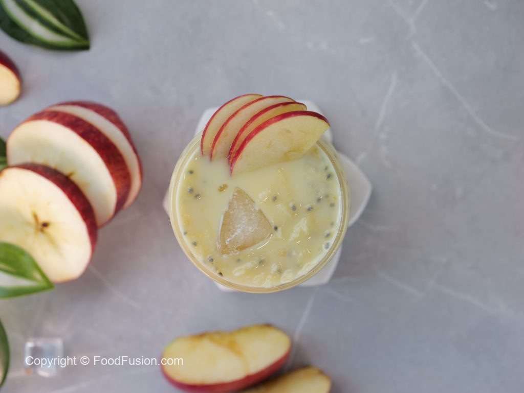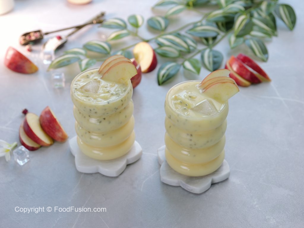 -In a large bowl,add ice cubes,milk,prepared sugar syrup,soaked basil seeds,apples (grate with the help of grater),mix well & serve!