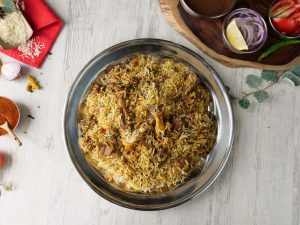 -Serve Arabic mutton biryani with tomato chutney & salad!