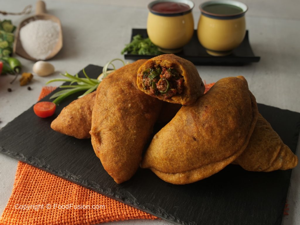 -Add prepared mince filling (2 tbs) & fold the dough with the help of wet cloth to make D-shape samosa shape (makes 8).