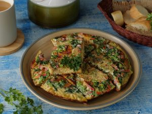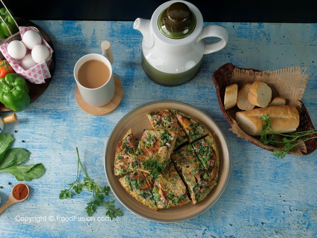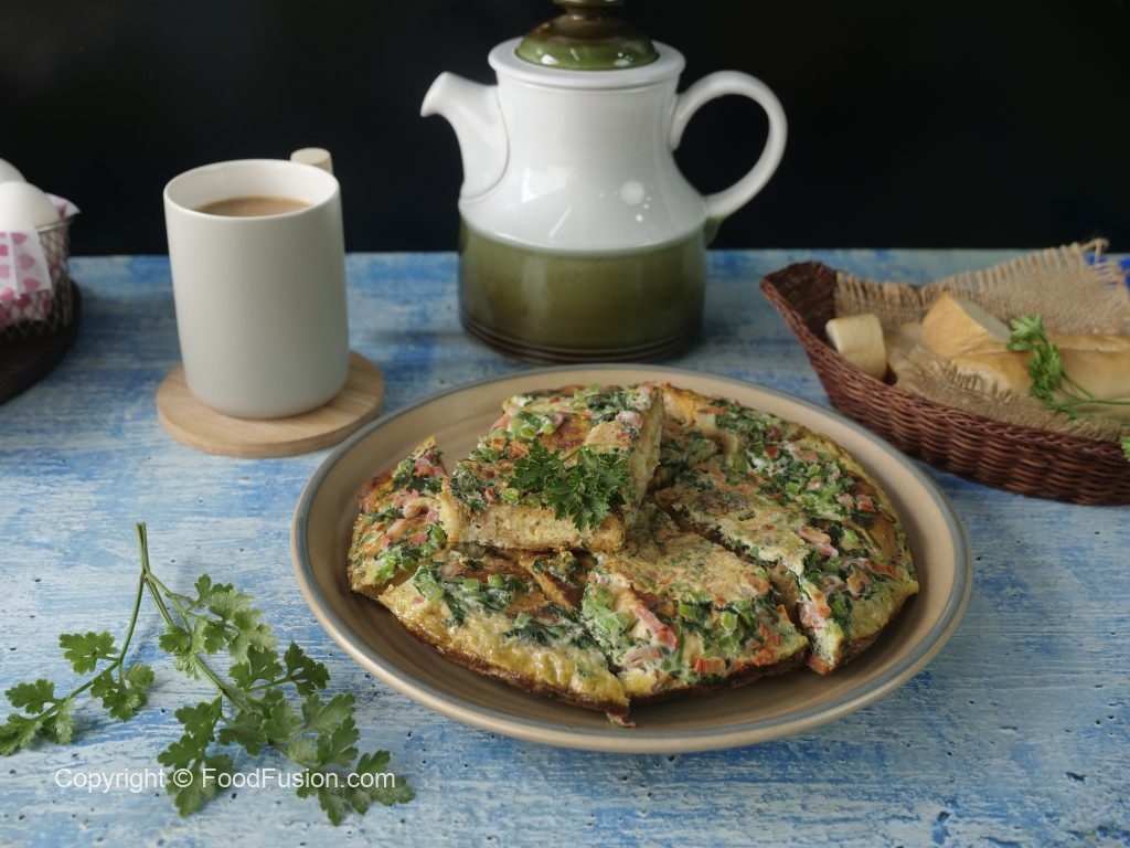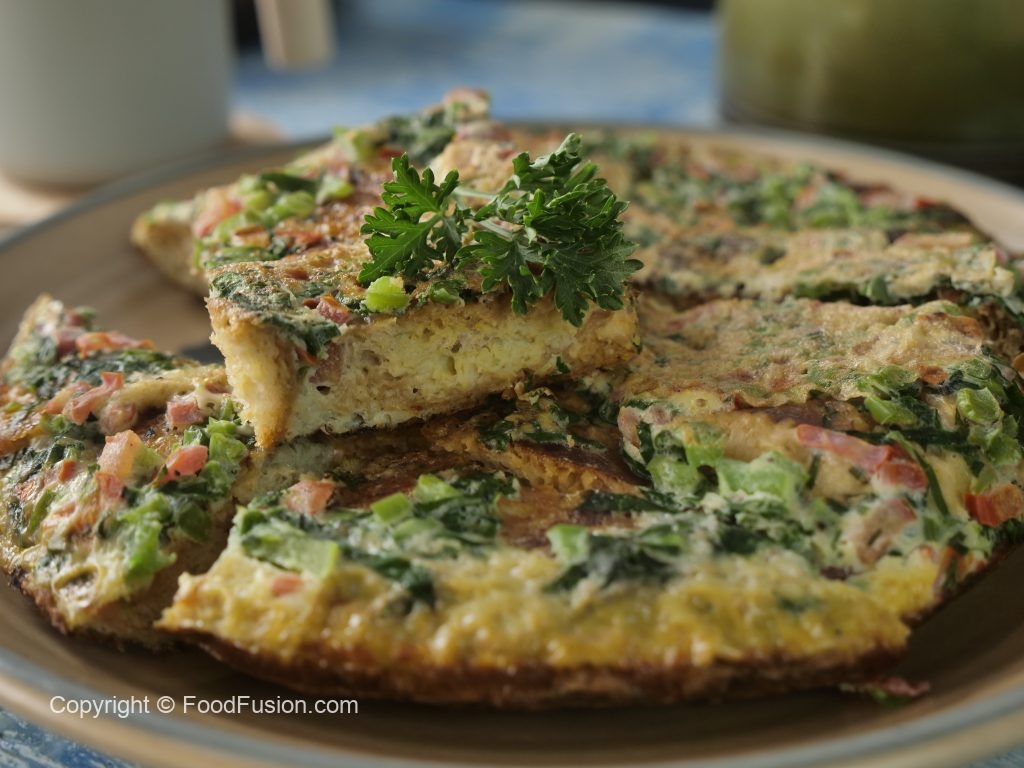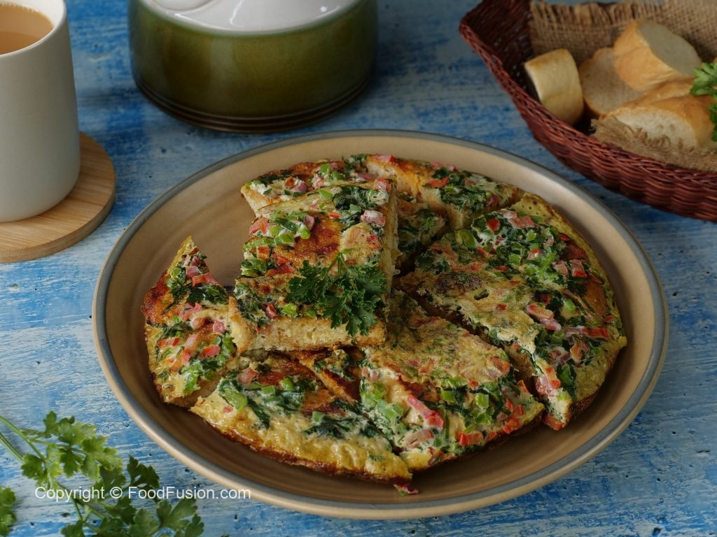 Serving plate per omelet ko flip ker lein aur slices mein cut ker ka serve karein!