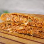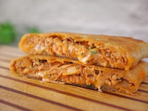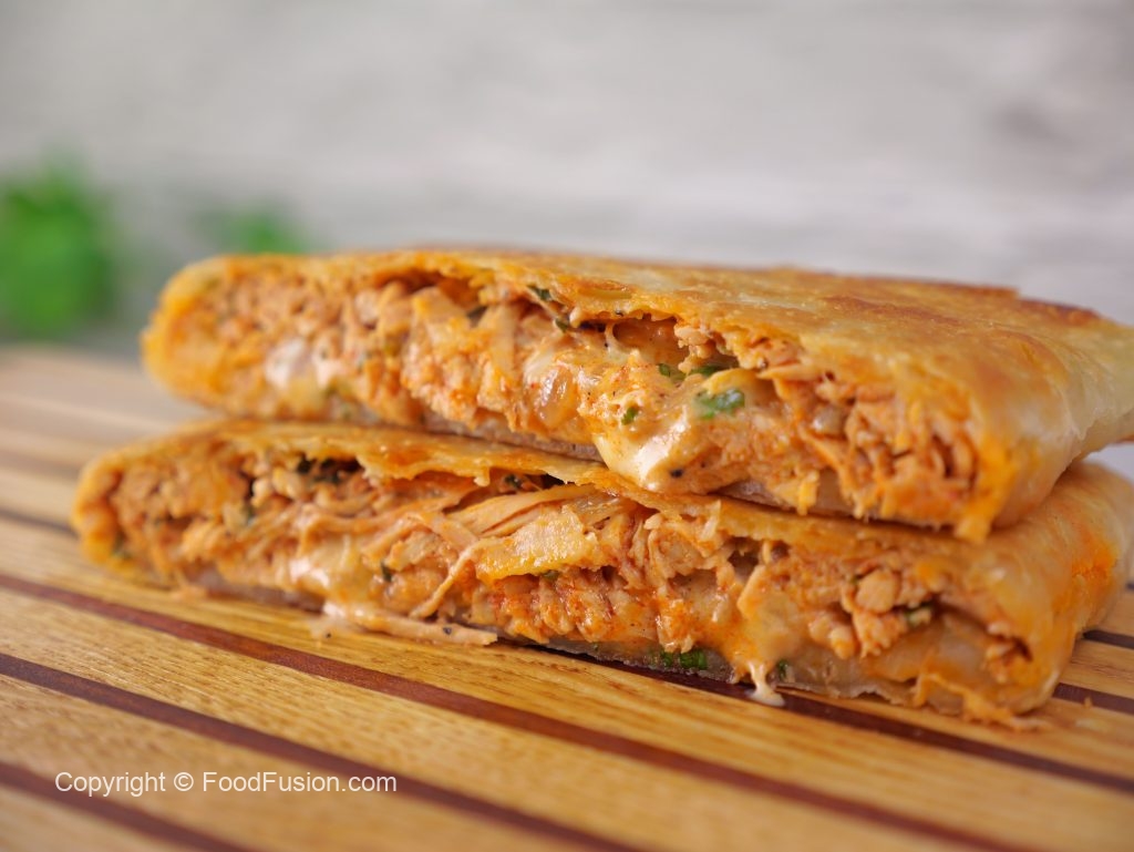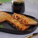 -Ab 2 tbs pheeta huwa anda,pyaz,hara dhania,hari mirch aur cheddar cheese slice rakhein aur dough ke charon sides fold karke whisked anday laga kar seal karein.