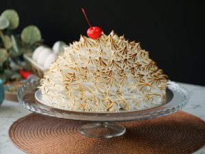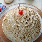 Apply thin layer of prepared meringue all over the cake and decorate with meringue flowers.