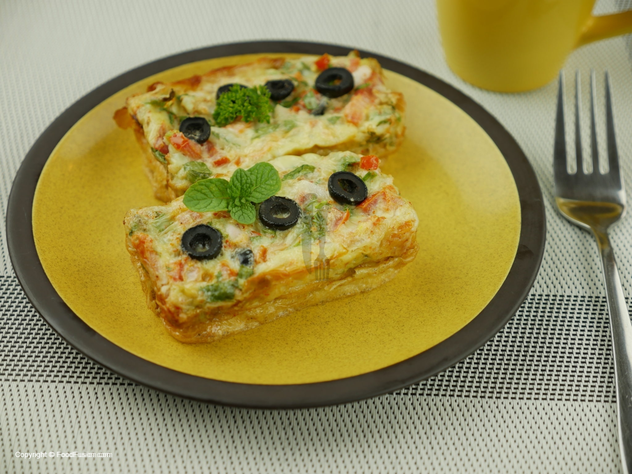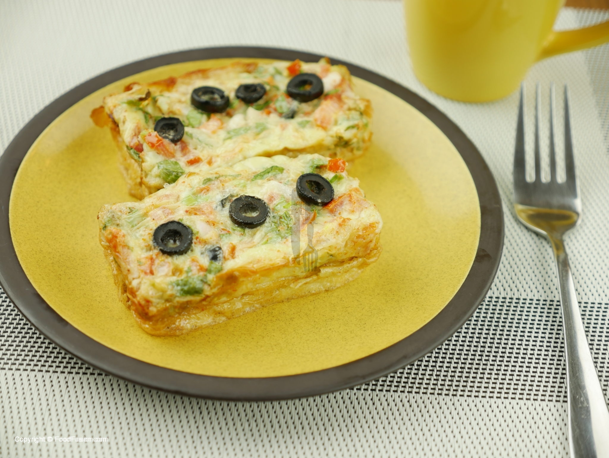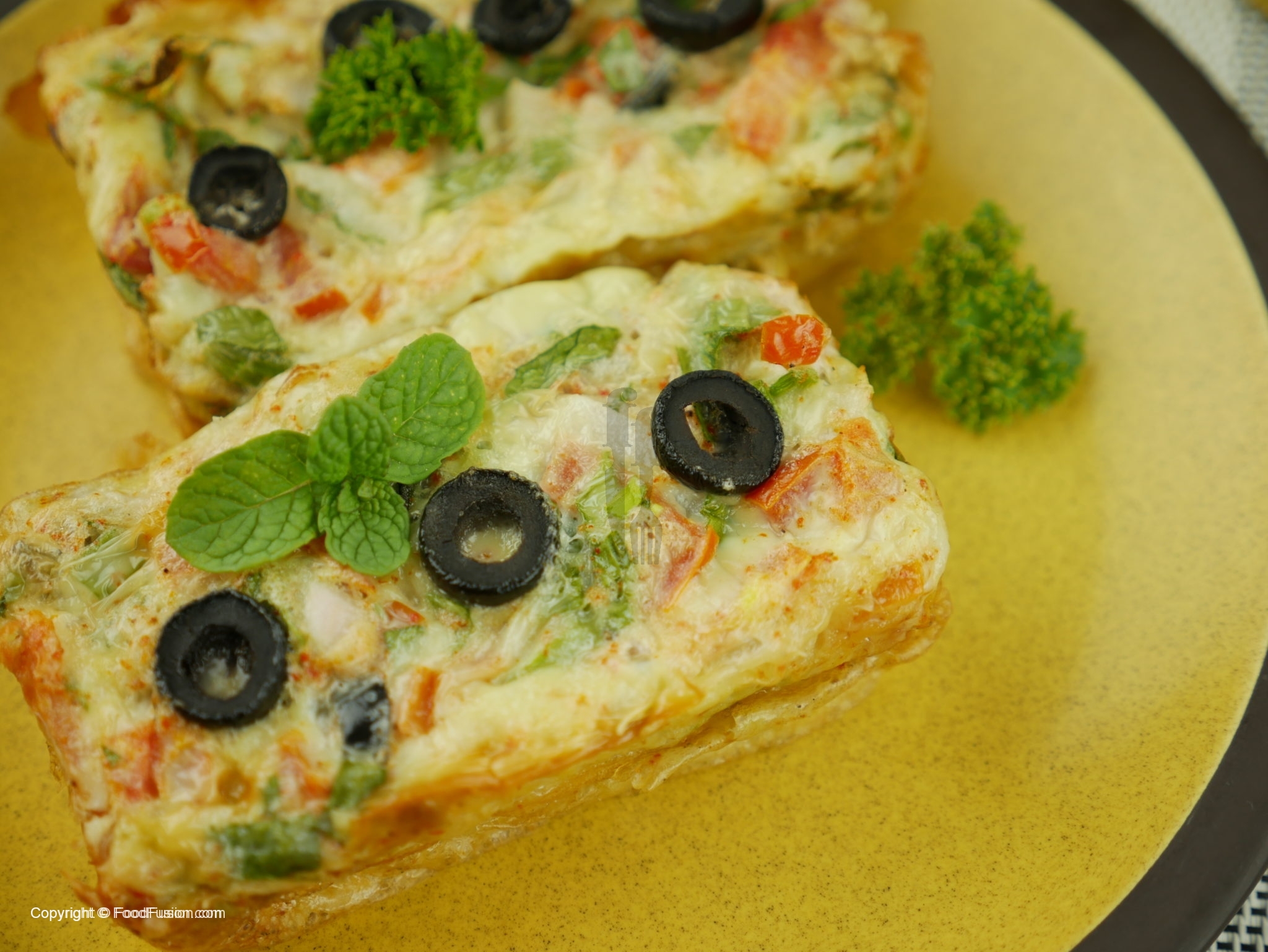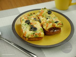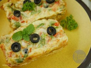 Mixture ko us tray me daliye aur us k upar se cheese k slices aur 3 se 4 katay hue olives rakh dijiye.