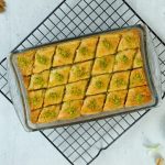 -Cut into diamond or square shapes of bakhlava using a sharp knife & separate the side of pan.