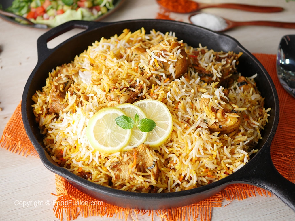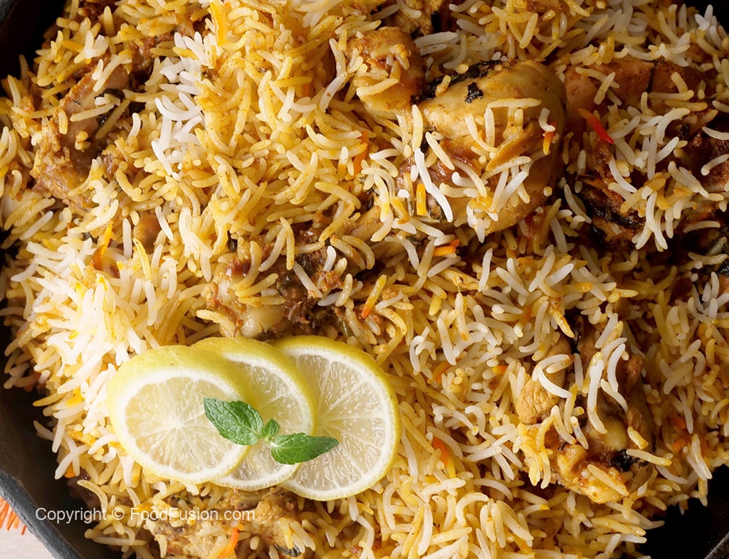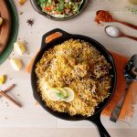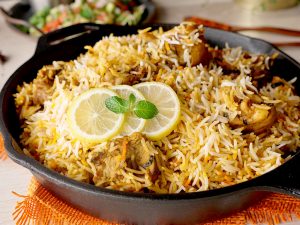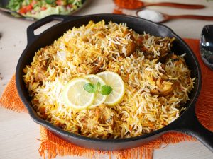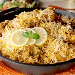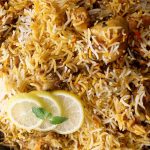 Add mint leaves,fresh coriander,fried onion,dried plums,boiled rice & sprinkle orange food color on top, cover & steam cook on low flame for 15-20 minutes.