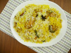 then add the rice and lastly topped with fried onions, coriander, reserved oil from chicken, water & color mixture and finally with kewra.