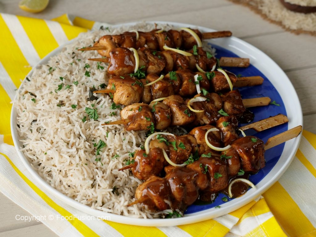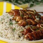 Serve lemon herb rice with chicken & mushroom skewers,drizzle prepared BBQ sauce and garnish with lemon skin,fresh parsley & serve!