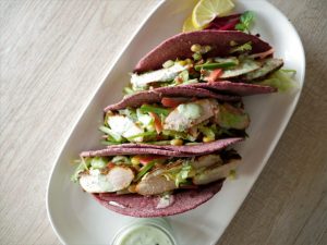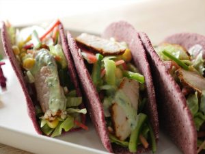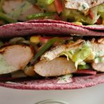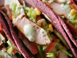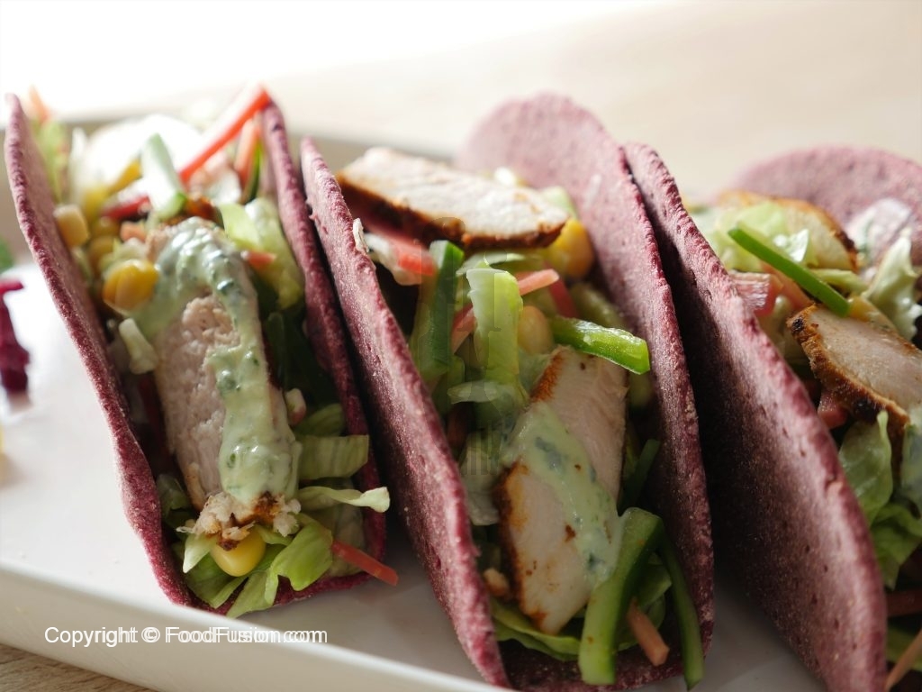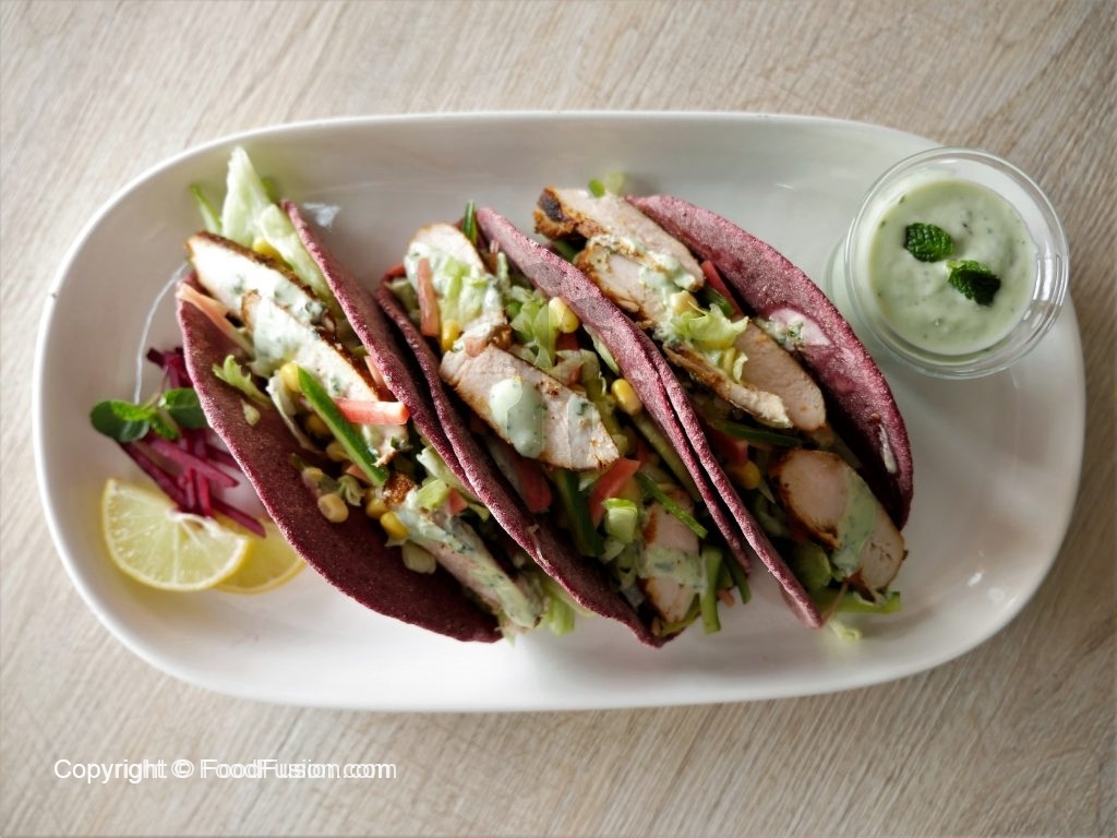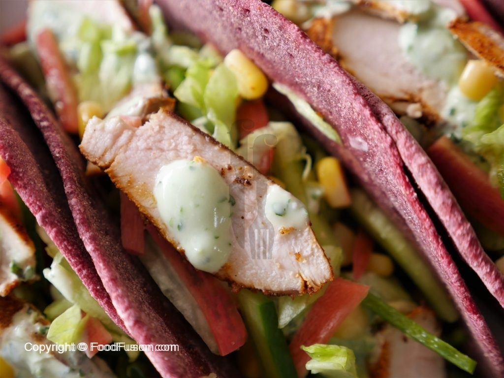 To assemble tacos,add salad,chicken slices,raita/green yogurt sauce & serve.