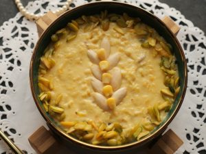 Garnish with almonds,corn kernels,pistachios & serve chilled!