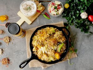 Serve bombay biryani with yogurt raita & salad.