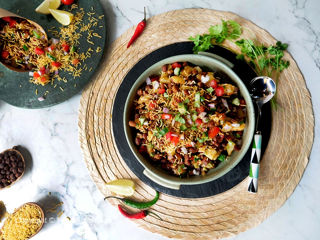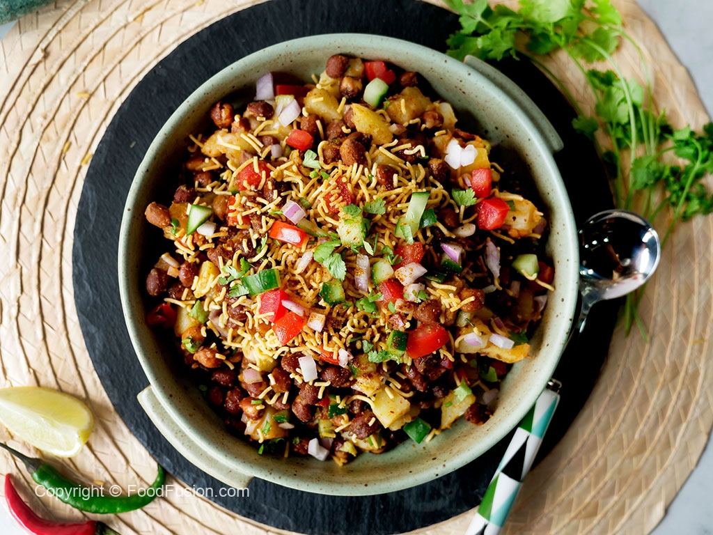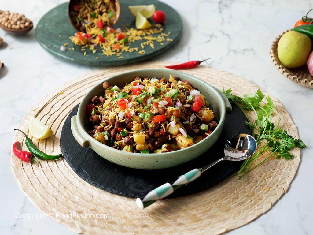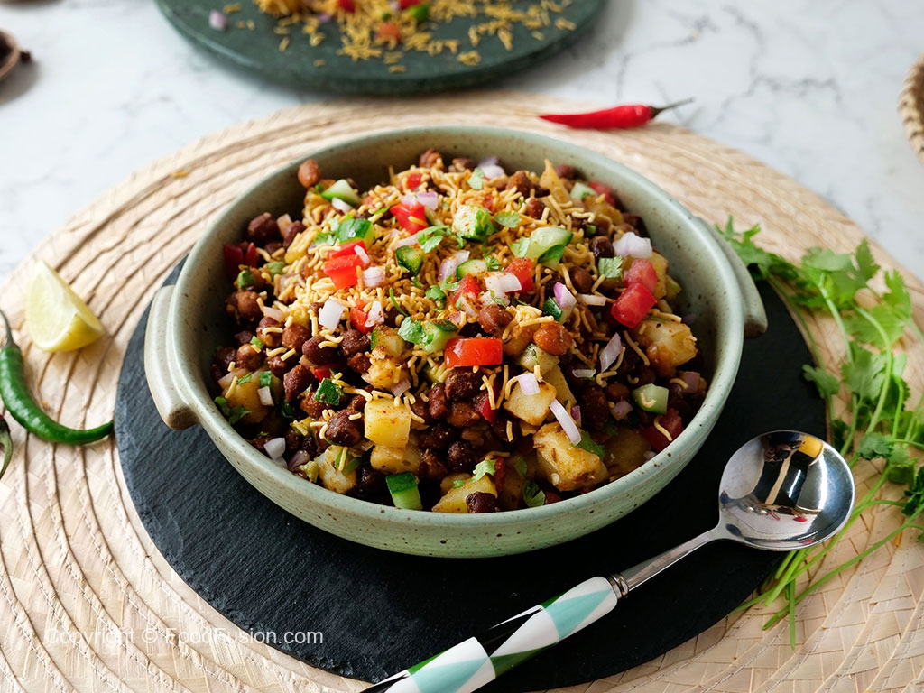 Bowl mein tayyar kalay chanay,boiled aalo,pyaz,tamatar,kheera,hari mirch,tamarind sauce,green chilli sauce,hara dhania,chaat masala aur lemon juice dal ker ache tarhan mix ker lein.