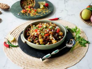 Serving dish mein tayyar chaat,sev nimco,tamatar,kheera,pyaz,lemon juice,chaat masala aur hara dhania dal ker serve karein!