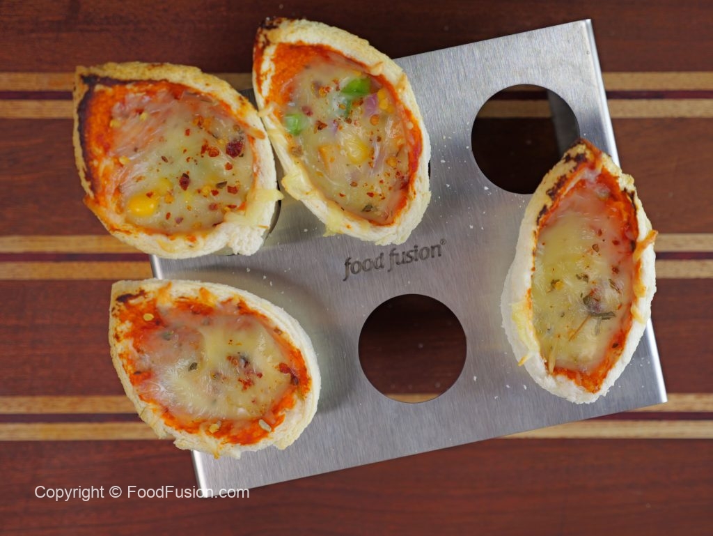 -Place bread cones on kulfi molds,apply pizza sauce,add prepared chicken filling,pizza cheese,corn kernels,onion,capsicum,pizza cheese,dried oregano & red chilli crushed (makes 8-9).