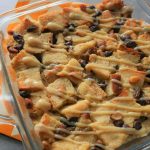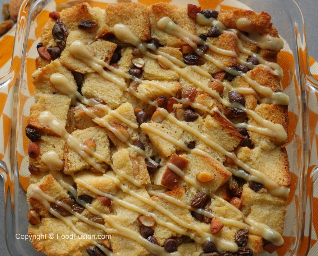 Add bread cubes,almonds,raisins,chocolate chips,prepared egg mixture,bread cubes,raisins,almonds, chocolate chip and prepared egg mixture.