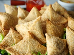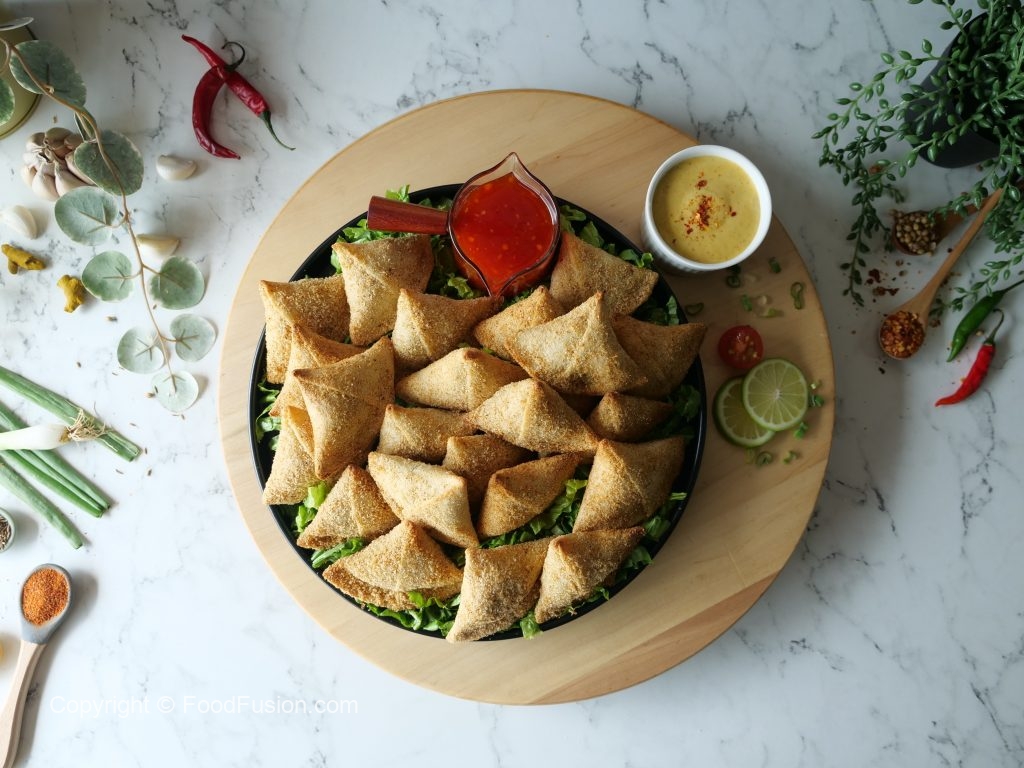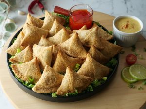 -In air fryer basket,place bread samosa and spray non stick spray on both sides of samosa & air fry at 160C for 12 minutes.