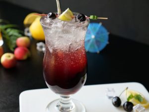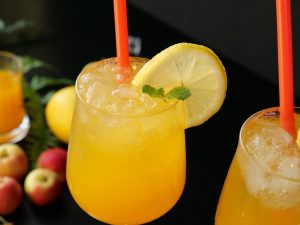 Add apple juice,prepared lemon syrup,ice & 7up.