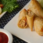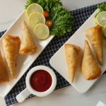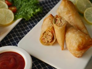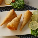 Take samosa wraps,apply flour paste and make pocket,add chicken filling in the center and fold into the shape of cone and apply flour mixture on the edges and bring the edges together and seal the edges properly (makes 14-15).