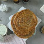 -Add & spread clarified butter,sprinkle garlic,prepared spice mix,fresh coriander,fold the paratha vertically from both sides & roll up.