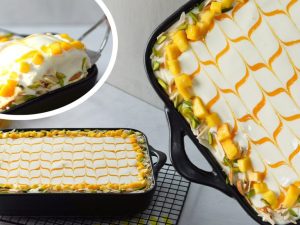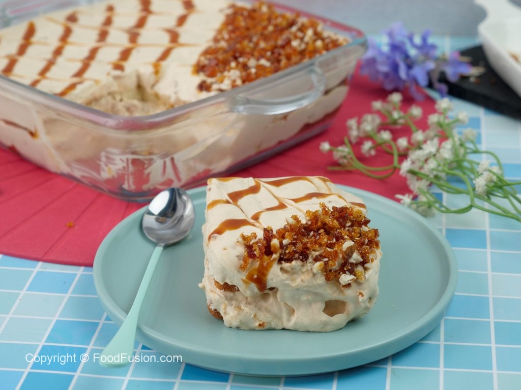 In a serving dish,add a layer of plain sponge cake,drizzle caramel sauce,caramel cream,plain sponge cake,caramel sauce,caramel cream and spread evenly.