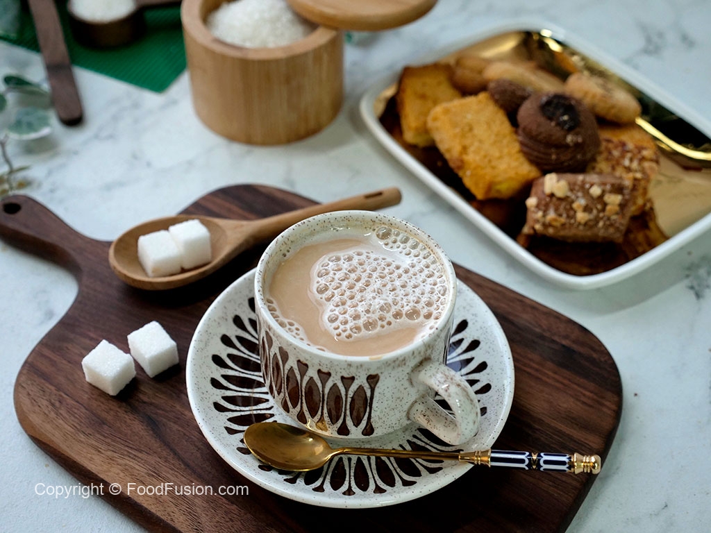 Serving cup mein cream milk aur black tea dal ker stir karein.