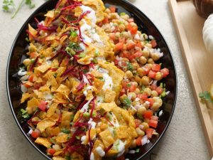 -In a serving platter,add chickpeas,tomato,onion,green chilli,chaat masala,fried potato chops, yogurt,green chutney,prepared imli ki khatti chutney,onion,prepared meethi khajoor chutney,papri, beetroot,green chilli,fresh coriander,chaat masala & serve!