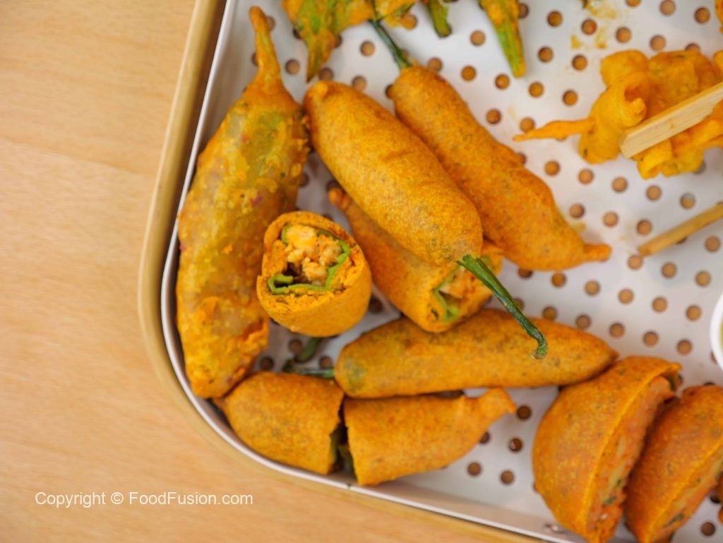 -Dip stuffed chilli in pakora batter & add in hot cooking oil & fry on medium flame until golden.