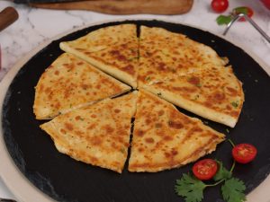 -On tortilla,add & spread prepared chicken & cheese filling on one side of tortilla & flip the other side over it (makes 5-6).