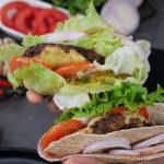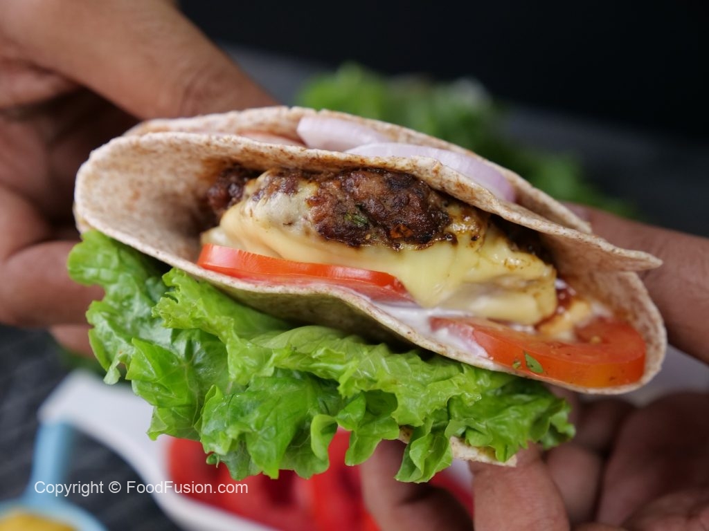 Add cheeseburger patty on one quarter side,add yogurt & tomato slices on second quarter side, tomato ketchup & onion on third quarter side,mustard paste,pickled cucumbers & lettuce leaves on fourth quarter side & fold each side on one another making a wrap & serve!