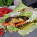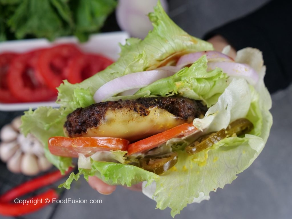On two iceberg leaves,add mustard paste & pickled jalapeno on one quarter side,add lite mayonnaise and tomato slices on second quarter side,tomato ketchup & cheeseburger patty on third quarter side,onion rings on fourth quarter side & fold each side on one another making a wrap & serve!