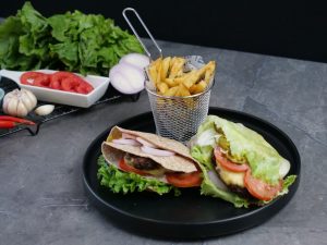 Two iceberg leaves lein aur ek quarter side per mustard paste & pickled jalapeno,dosray per mayonnaise & tamatar slices,tesaray per tomato ketchup & cheeseburger patty aur forth per pyaz rings rakh dein,tamam sides ko fold ker ka wrap tayyar ker lein & serve karein!