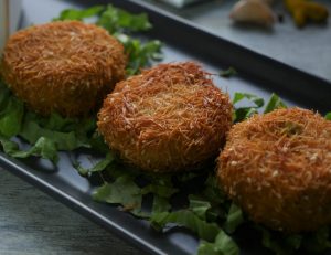 Now dip cutlets into beaten eggs and coat in crushed vermicelli.