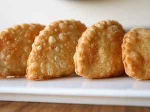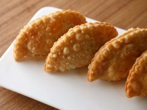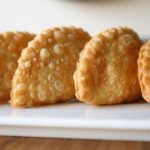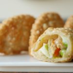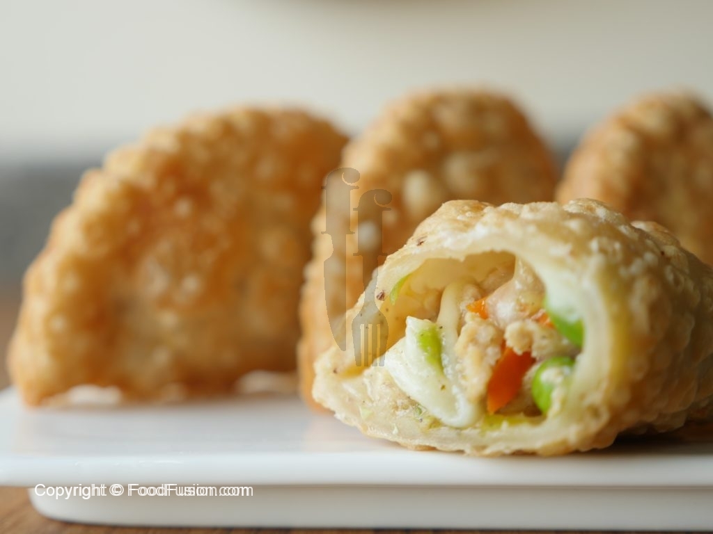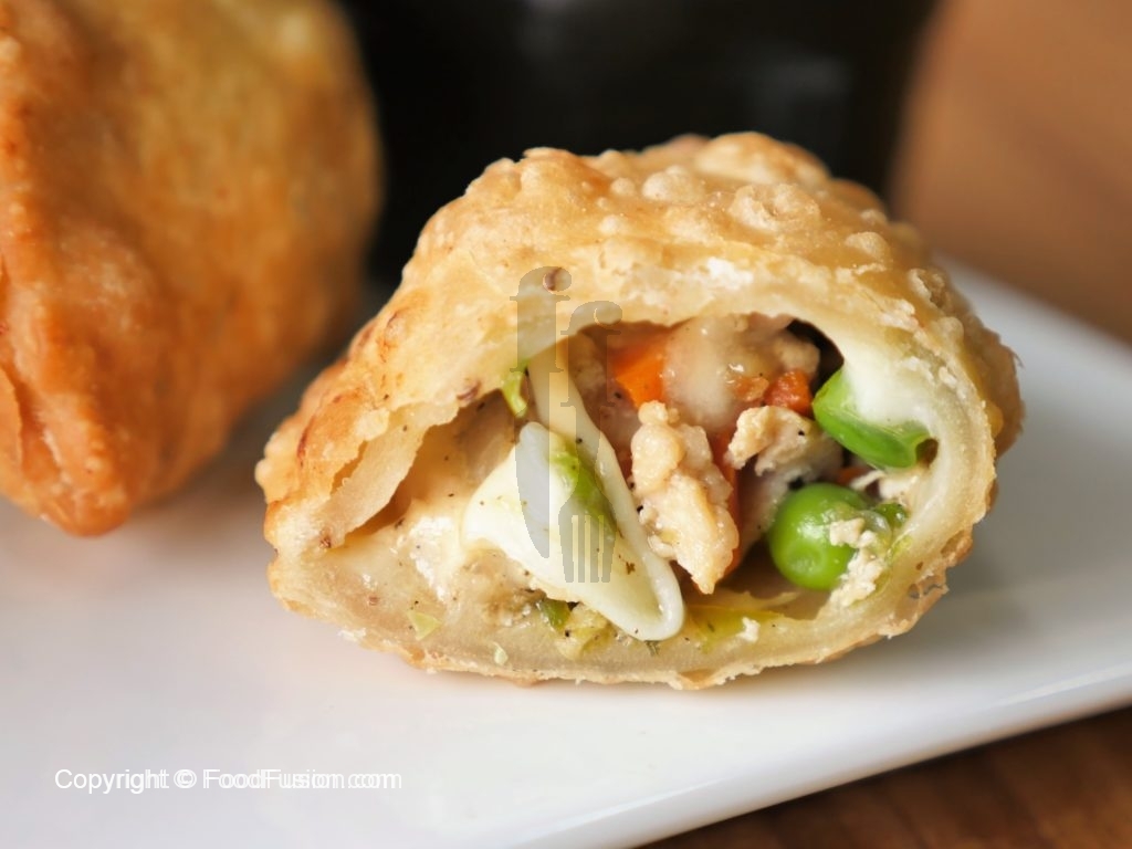 Take a dough,add chicken filling and mozzarella cheese,apply water at the edges,fold it and press and seal the edges with cookie cutter.