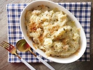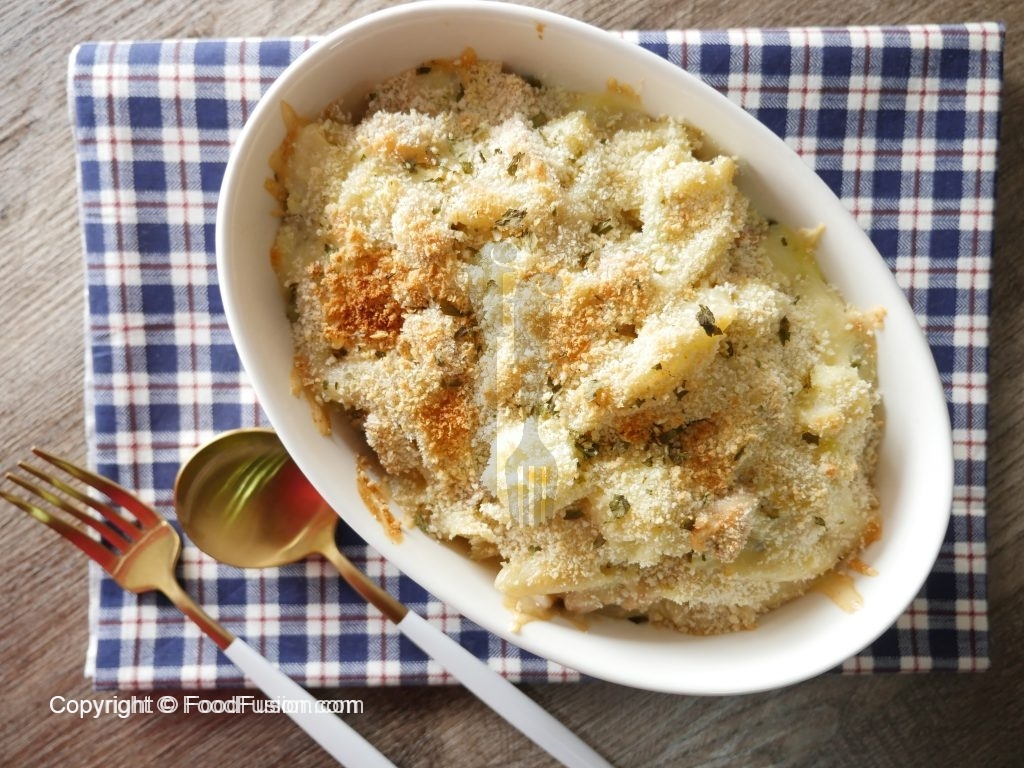 In casserole dish or baking dish,add cooked pasta,breadcrumbs and sprinkle dried parsley.