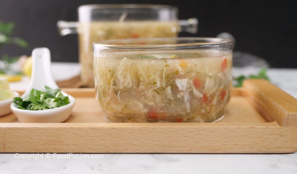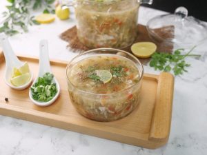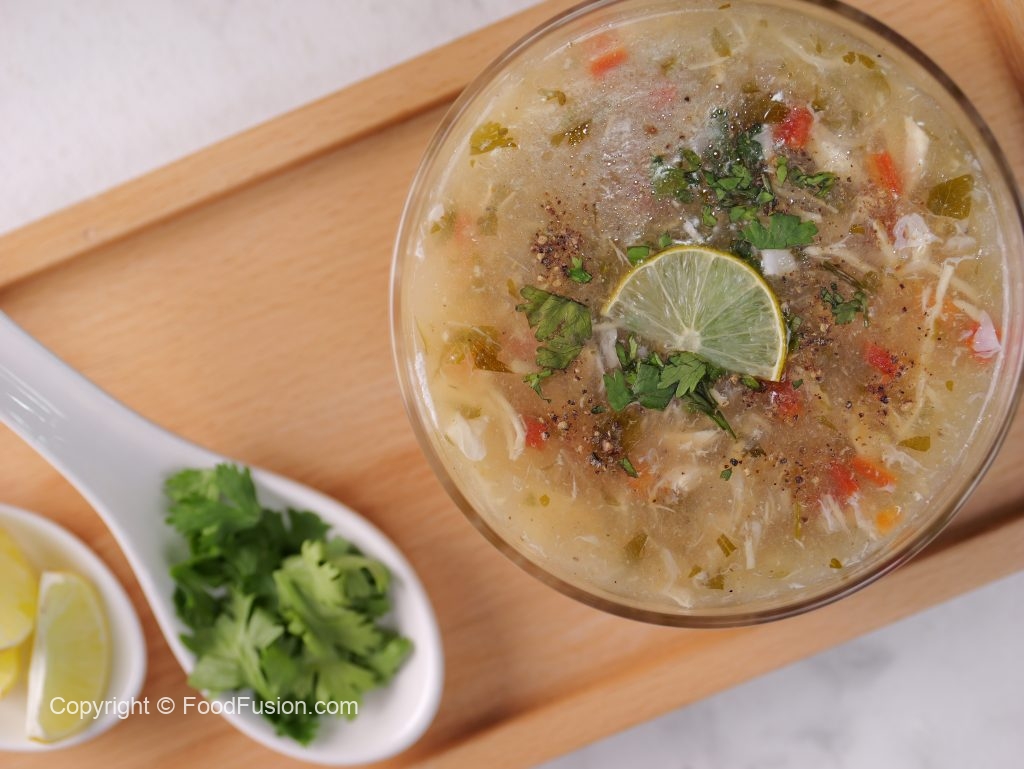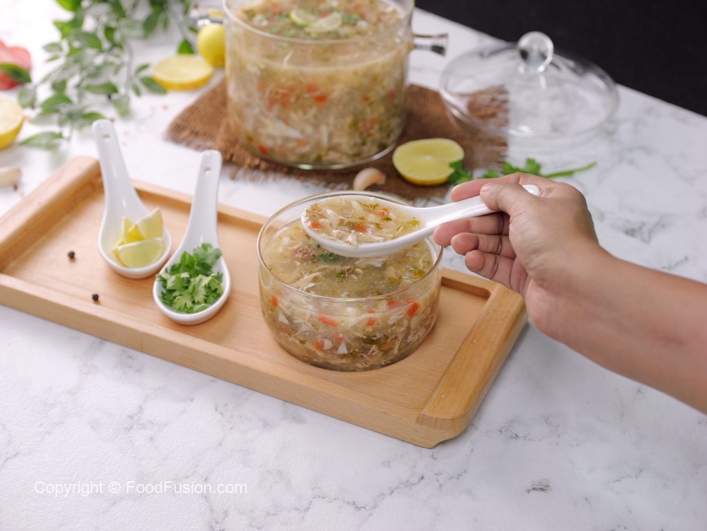 -Serving bowl mein lemon juice,tayyar soup,kali mirch crushed,hara dhania,lemon slice dal dein & garam serve karein!