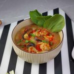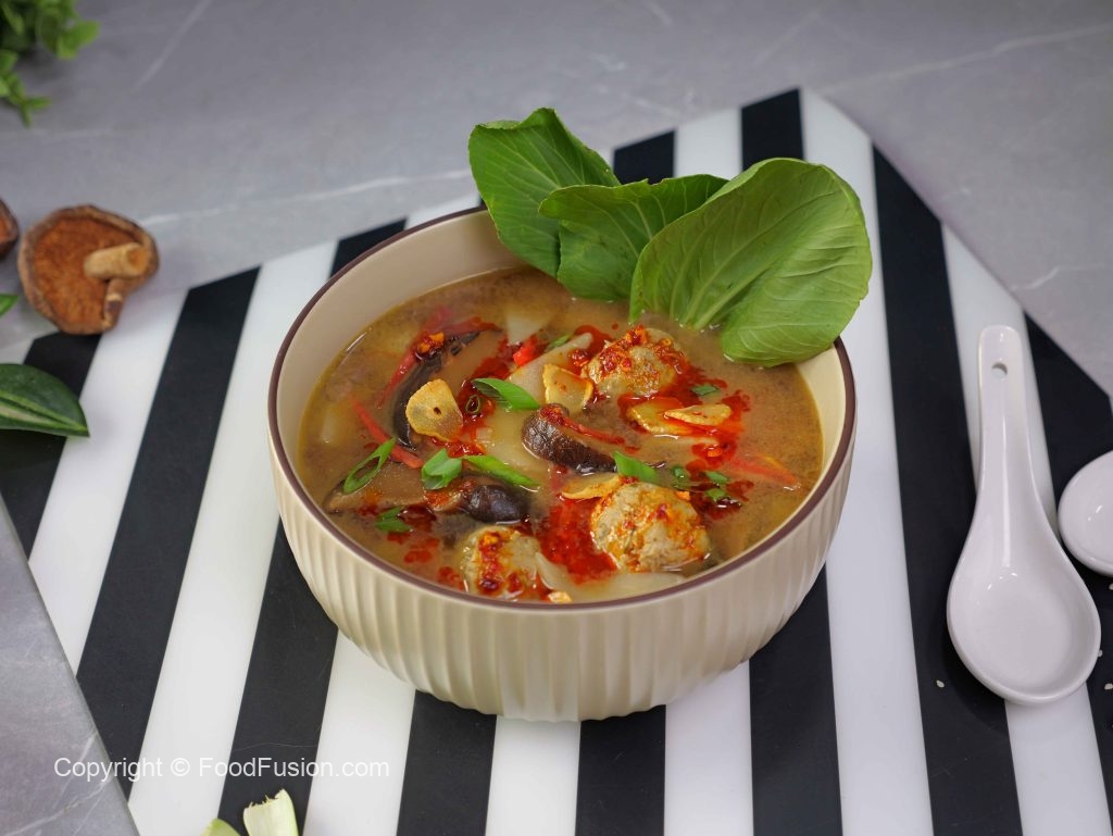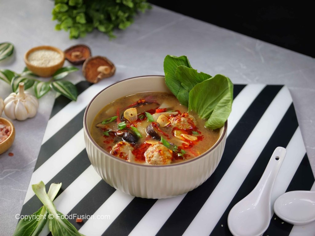 -In a serving bowl,add wonton soup,bok choy leaves,chilli oil,spring onion leaves,fried garlic & serve!