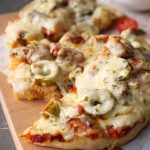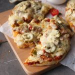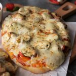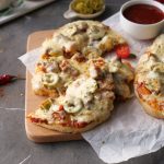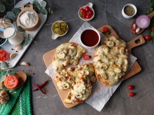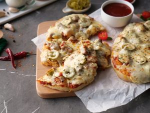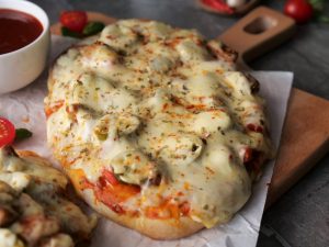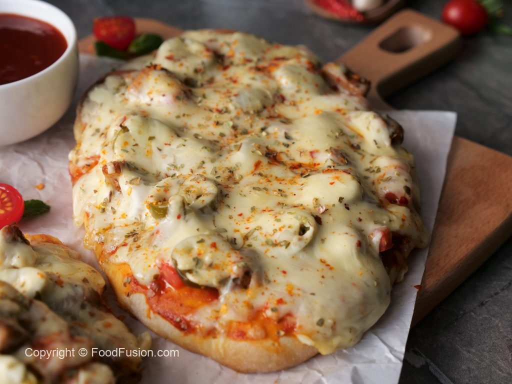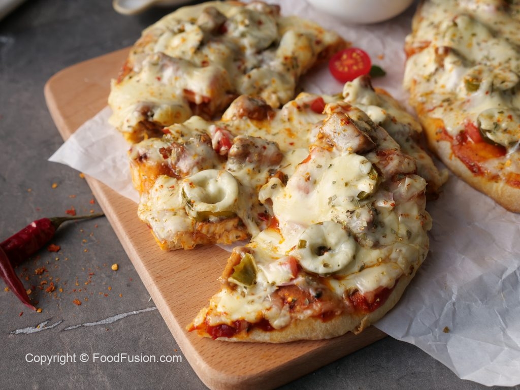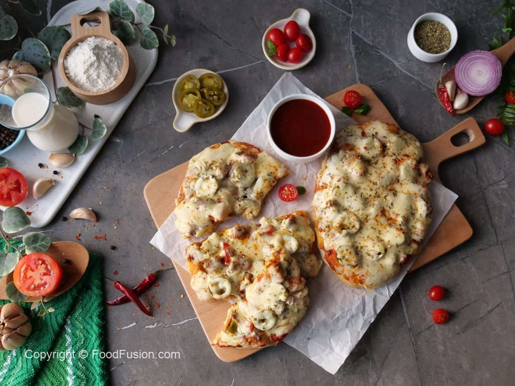 -Pizza sauce dal ker pheela lein,cooked chicken,pyaz,tamatar,pickled jalapenos,mozzarella cheese,cheddar cheese,dried oregano & lal mirch crushed dal dein (makes 6).
