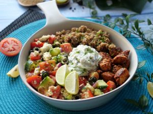 -In a bowl,add iceberg lettuce,prepared mini chicken kafta (approx. 30),black olives,green olives,cucumber,reddish, onion,yellow cherry tomatoes,red cherry tomatoes,fresh coriander,2-3 tbs of prepared gm salad dressing & give it a good mix.
