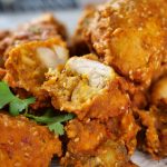 -In a bowl,add yogurt,ginger garlic paste,soy sauce,lemon juice,red chilli powder,coriander seeds,chaat masala,turmeric powder,red chilli crushed,cumin seeds,black pepper,orange food colour,carom seeds, pink salt & whisk well.
