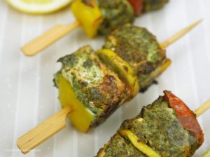 Ab marinated chicken,color bell pepper,tamatar,pyaz aur lemon slices ko skewers per assemble ker lein.