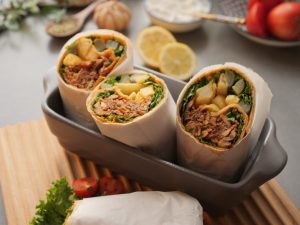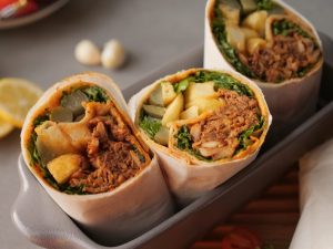 -Butter paper per lavash flatbread rakh dein aur tayyar sauce dal ker pheela lein,salad patta,cooked chicken,potato fries,pickled cucumber,tomato ketchup,mayonnaise dal ker sides ko fold ker lein aur roll ker ka butter paper mein warp ker lein (makes 6) & serve karein.