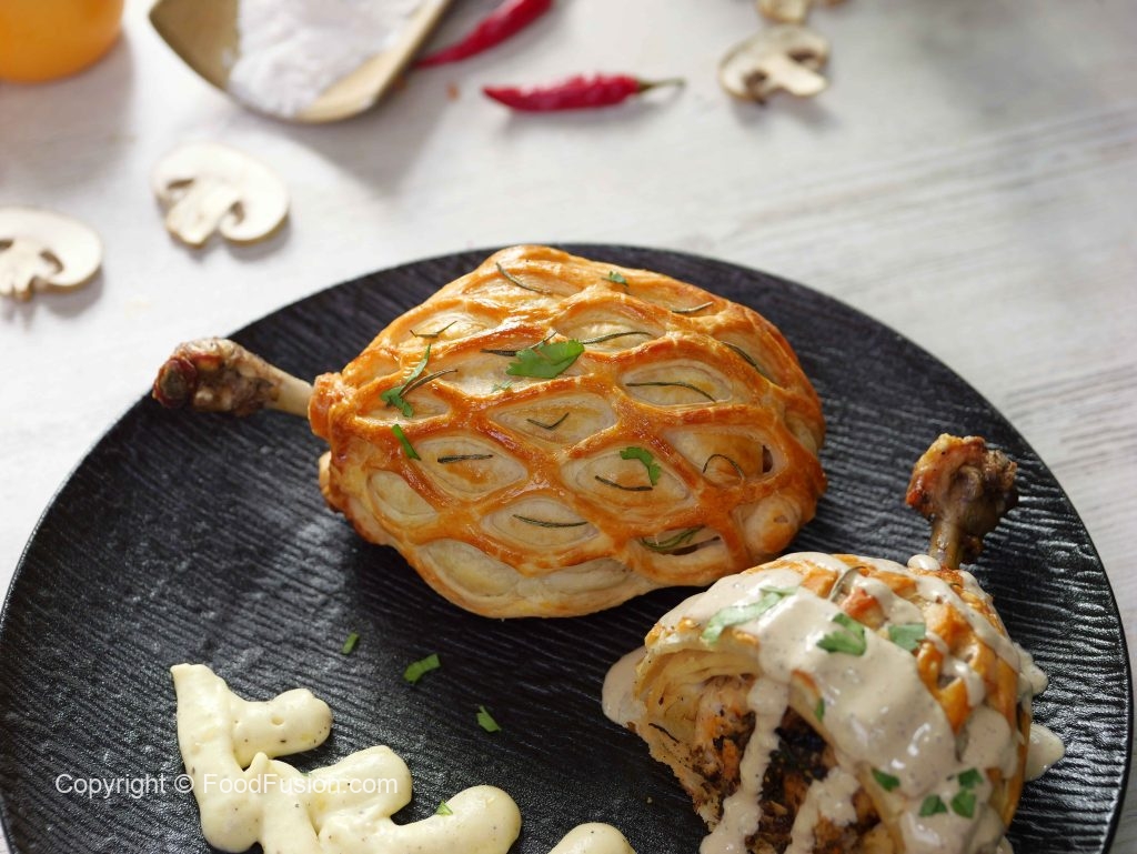 -Plain puff pastry par bologna slices rakhein, upar steamed chicken rakhein, phir fold kar ke chicken ko puff pastry mein wrap kar lein. Corners par egg wash laga kar achi tarah seal kar lein aur upar se doosri puff pastry se coat kar dein.