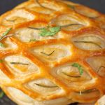 -Place it in a baking tray (greased & lined with baking paper), refrigerate for 15-20 minutes, apply egg wash, garnish with thyme leaves.